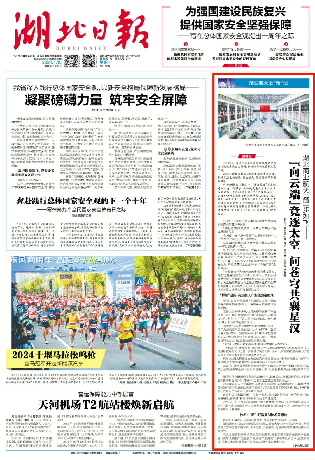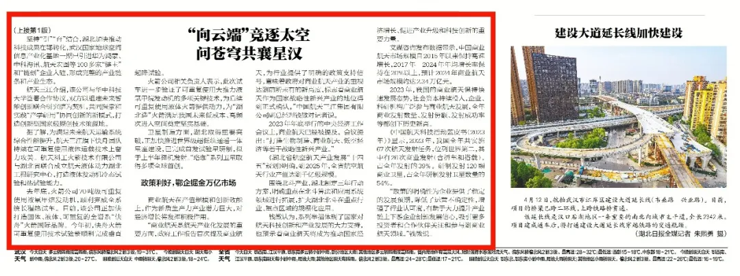 第九個“中國航天日”即將來臨,主題為“極目楚天 共襄星漢”。近日,《湖北日報》推出“商業(yè)航天上‘新’記”系列報道,首篇文章以《湖北商業(yè)航天“箭”步如飛——“向云端”競逐太空 問蒼穹共襄星漢》為題,聚焦湖北商業(yè)航天高質量發(fā)展新路徑,重點報道了航天三江快舟系列火箭創(chuàng)新發(fā)展,持續(xù)發(fā)揮航天全產(chǎn)業(yè)鏈布局優(yōu)勢,打造創(chuàng)新型國家級原創(chuàng)技術策源地。