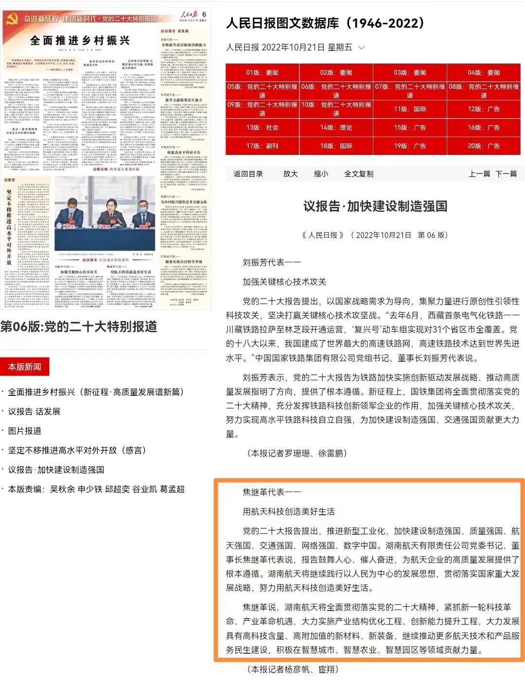 黨的二十大報告提出,推進新型工業(yè)化,加快建設制造強國、質量強國、航天強國、交通強國、網(wǎng)絡強國、數(shù)字中國。湖南航天有限責任公司黨委書記、董事長焦繼革代表說,報告鼓舞人心、催人奮進,為航天企業(yè)的高質量發(fā)展提供了根本遵循。湖南航天將繼續(xù)踐行以人民為中心的發(fā)展思想,貫徹落實國家重大發(fā)展戰(zhàn)略,努力用航天科技創(chuàng)造美好生活。